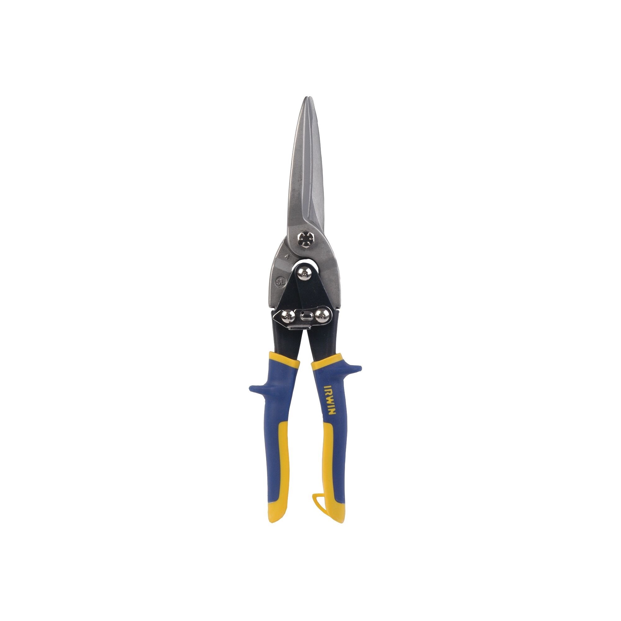 The Irwin 21304ZR ProSnip Utility Snips cut through sheet metal, wire mesh, and other materials with confidence. Blades are forged from heat-tempered polished alloy steel and serrated for maximum cutting strength and durability. Compound leverage design reduces the hand force required to cut, minimizing fatigue on long jobs. Steel handles with comfort grips provide a secure hold. A safety locking latch keeps blades closed safely during storage and transport.