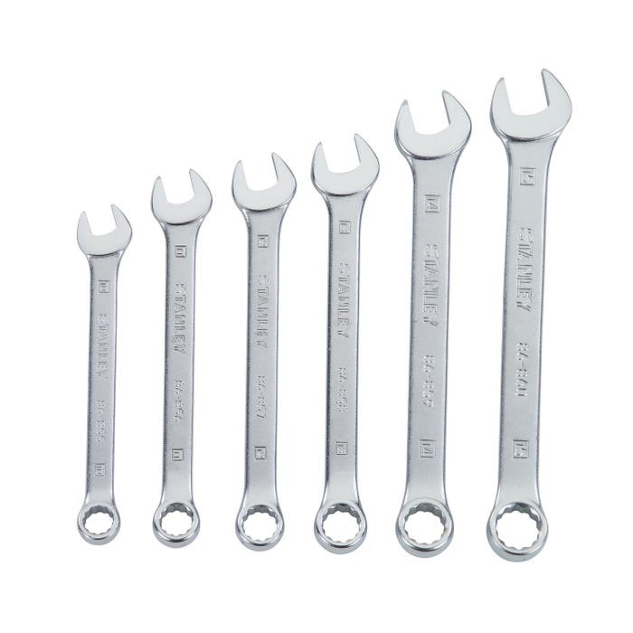 STANLEY 6-PIECE METRIC COMBINATION WRENCH SETProfessional-quality combination wrench set for metric fasteners. Chrome vanadium steel construction provides excellent torque, strength, and durability for demanding applications.
