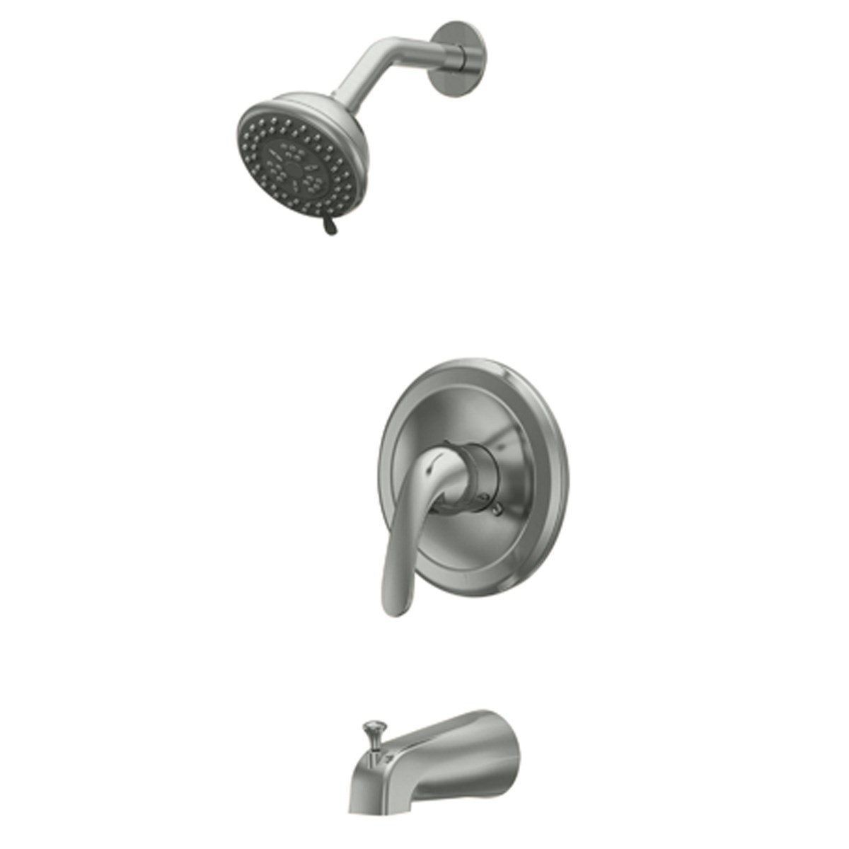 COMPASS NOBLE SINGLE HANDLE TUB AND SHOWER SET - BRUSHED NICKELUpgrade your bathroom with the Compass Noble single handle tub and shower set in brushed nickel. This complete set includes everything needed for a professional installation, featuring an anti-scald pressure balanced valve for safe, comfortable water temperature control.