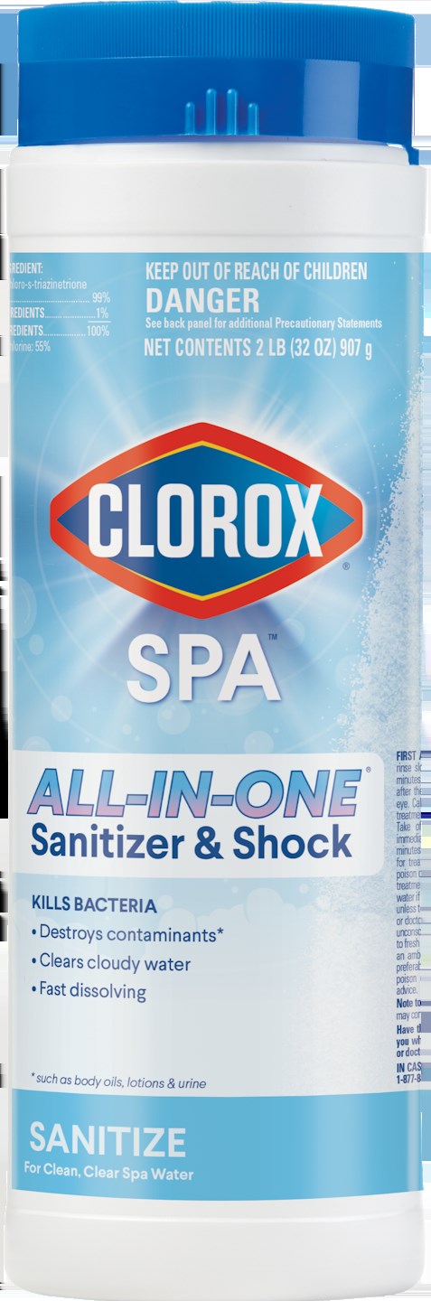 CLOROX POOL AND SPA ALL-IN-ONE SANITIZER AND SHOCKThis Clorox stabilized chlorinator combines powerful sanitizing and shocking capabilities in one fast-dissolving formula, making it essential for maintaining clean, clear spa and hot tub water. The all-in-one formula destroys contaminants while clearing cloudy water with minimal wait time.