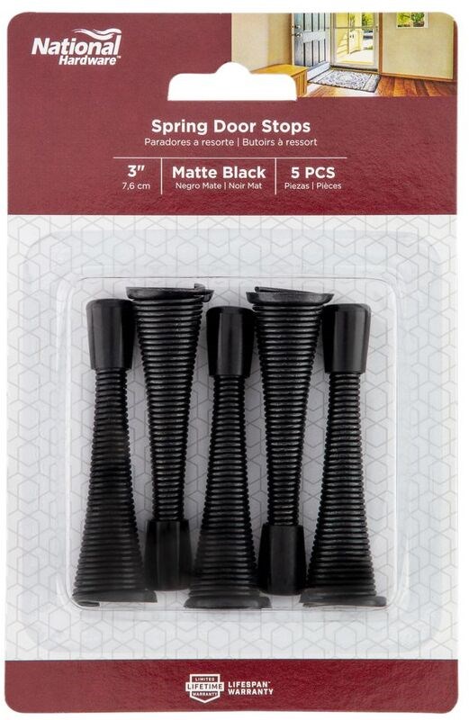 NATIONAL SPRING DOOR STOP - MATTE BLACK, 3"The National Hardware N830-577 Spring Door Stop prevents doors from damaging walls by absorbing impact with a flexible spring design. Surface mounted for easy DIY installation, this door stop includes a mounting bracket and hardware. The matte black finish provides a clean, modern look that complements contemporary door hardware.