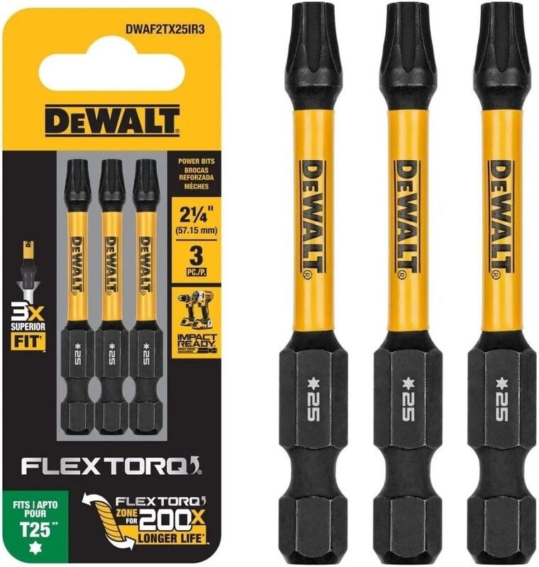 DEWALT FLEXTORQ IMPACT SCREWDRIVING BIT - T25, 3-PACKEngineered for use with impact drivers, this FlexTorq bit features a flex zone that absorbs impact energy to extend bit life up to 200X longer than standard bits.