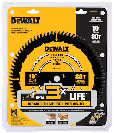 DEWALT FINE FINISH SAW BLADE - 10", 80 TOOTHThis DeWalt 10" carbide-tipped circular saw blade features 80 teeth with a 5-7 degree hook angle, delivering the smoothest possible cuts for finish work. The thin kerf design reduces material waste, while the ATB (alternate top bevel) tooth geometry produces near-polished edges on hardwood, melamine, laminate, and non-ferrous metals.
