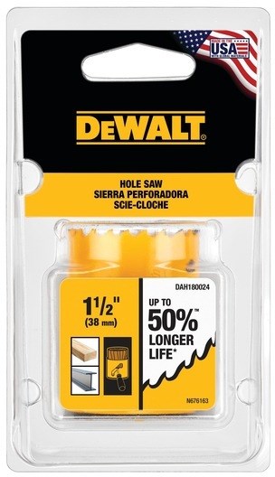 DEWALT BI-METAL HOLE SAW - 1-1/2"Cut clean holes in wood, metal, and plastic with this DeWalt 1-1/2" bi-metal hole saw. Features a high-speed steel cutting edge and patented tooth design that optimizes chip removal for efficient drilling and up to 50% longer life compared to prior generation models.