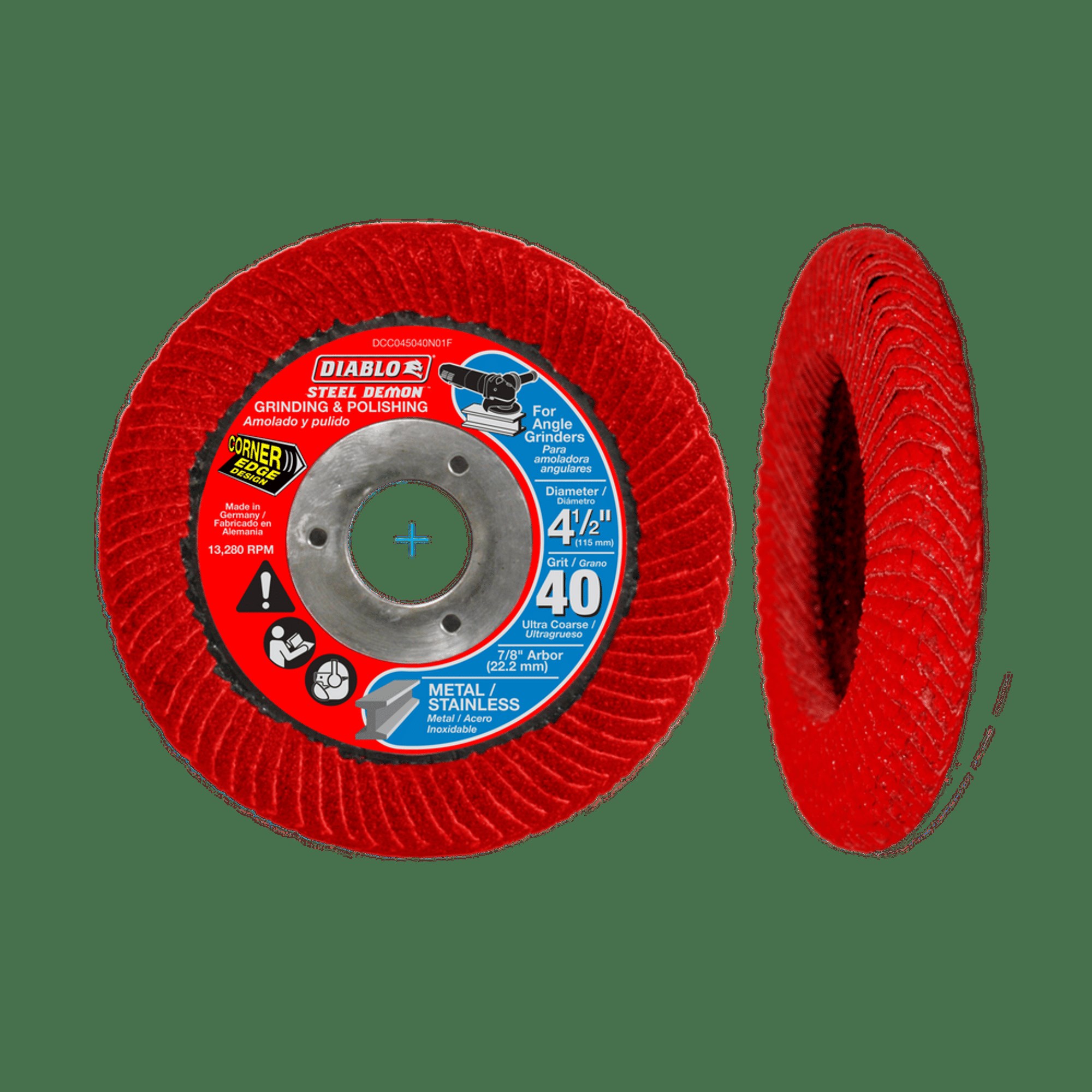 STEEL DEMON CORNER-EDGE FLAP DISCThe Diablo Steel Demon Corner-Edge Flap Disc delivers up to 10x faster material removal than standard grinding wheels. The premium zirconium blend abrasive combined with a Type 29 conical design provides aggressive grinding performance and long sanding life. The rounded corner-edge design allows you to reach difficult areas and provides precise material removal with reduced vibration. Simultaneously grinds and polishes in one step for efficient metalworking.