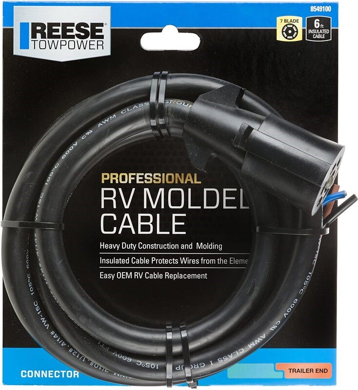 REESE Towpower Professional Series 7-way molded trailer connector with heavy duty 7-way insulated cable. Molded with encapsulate terminals and wires to form one weather resistant, non-corrosive assembly.