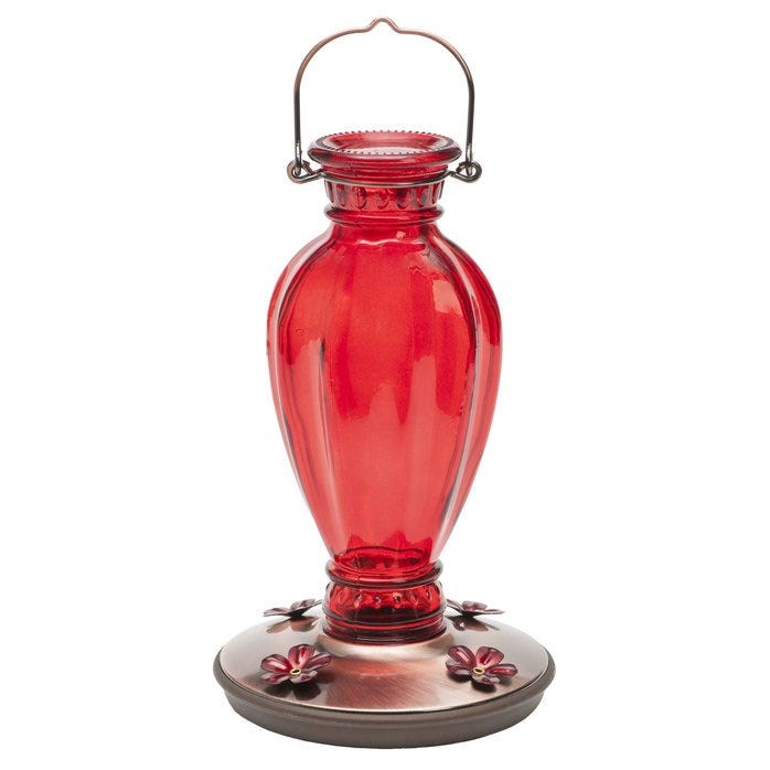 DAISY VASE VINTAGE GLASS HUMMINGBIRD FEEDER - 18 OZCharming vintage-style glass hummingbird feeder with a red luster finish that naturally attracts hummingbirds. The wide-mouth glass bottle makes filling and cleaning easy, and the snap-apart base allows thorough access for maintenance. Copper-finish hanging loop adds an elegant touch.
