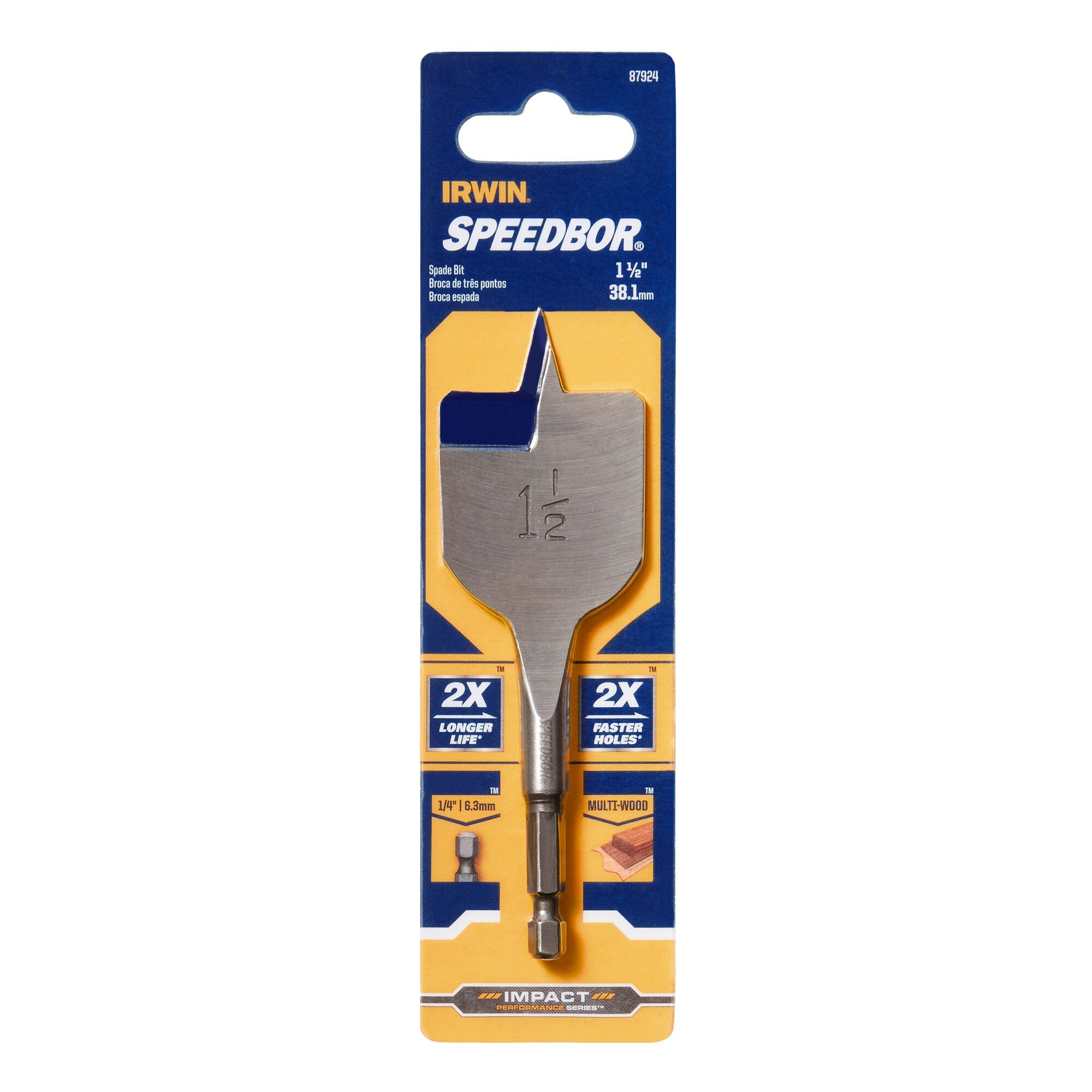 IRWIN SPEEDBOR SHORT LENGTH SPADE BIT - 1-1/2" x 4"The Irwin Speedbor short length spade bit is designed for drilling in tight spaces where standard-length bits will not fit. The Blue Groove point and cutting edge provide faster chip removal, while double-cutting spurs scribe the outside of the hole to reduce breakout. A 1/4" grooved hex shank prevents slipping in the drill chuck.