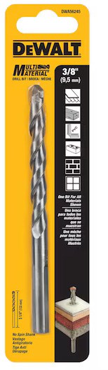 DEWALT MULTI-MATERIAL DRILL BIT - 3/8"The DeWalt Multi-Material Drill Bit drills through wood, metal, plastic, masonry, and tile with one bit -- no switching needed between materials. The carbide split point tip with 135-degree geometry starts on contact without walking, even on tile and masonry. The 3-flat no-spin shank prevents the bit from slipping in the chuck under high torque.