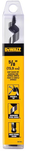DEWALT SHORT POWER SHIP AUGER BIT - 5/8"DeWalt Power Ship auger bits feature a self-feeding spur for fast material penetration and a dual cutting edge for maximum durability, even when hitting nails. The hollow center flute design provides aggressive chip extraction for cleaner, faster holes in wood framing and general construction.