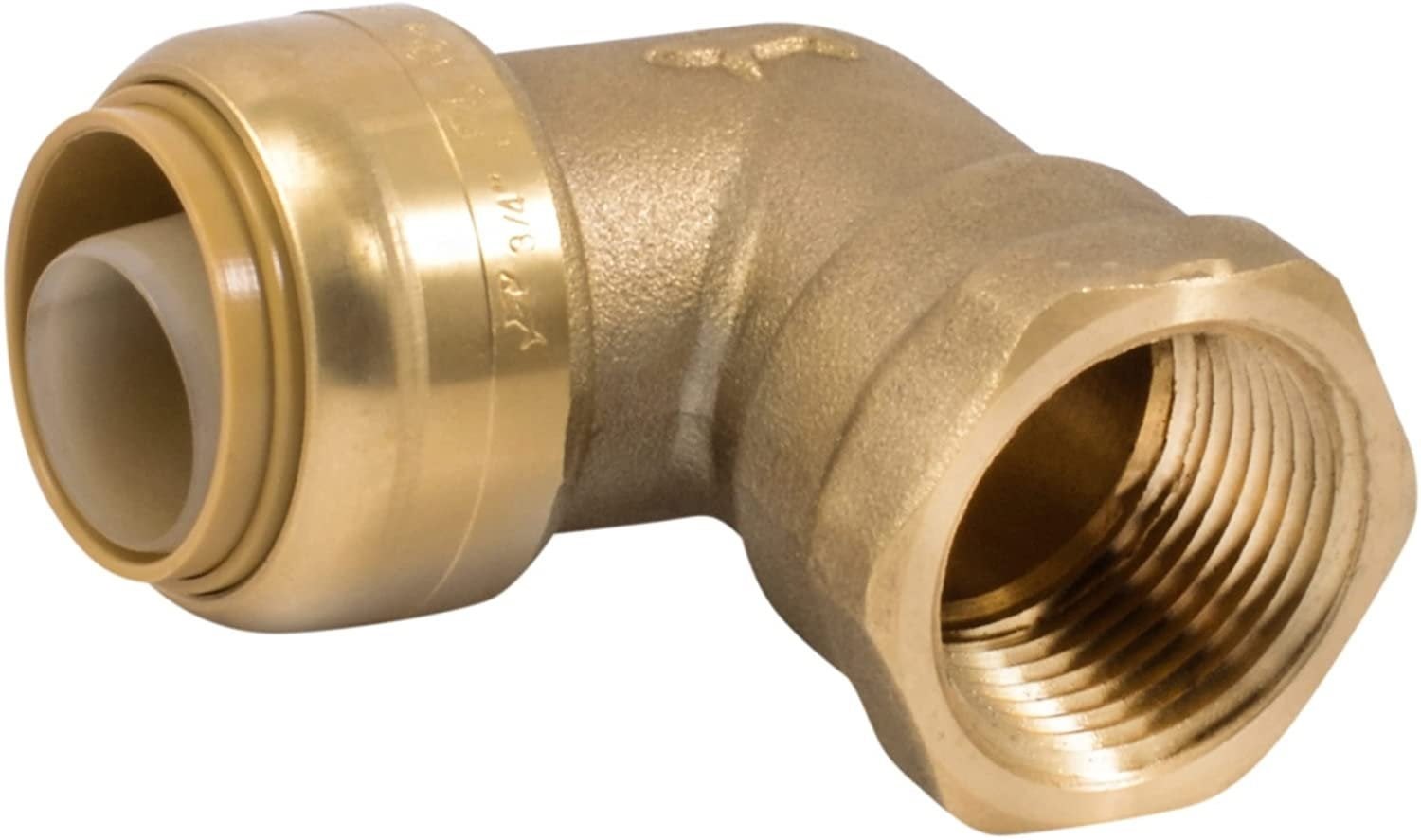 The SharkBite UR314A female adapter elbow connects push-to-connect pipe to a 3/4" female iron pipe (FIP) threaded outlet at a 90-degree angle. Installs in seconds without special tools, solder, clamps, or glue - even in wet lines.