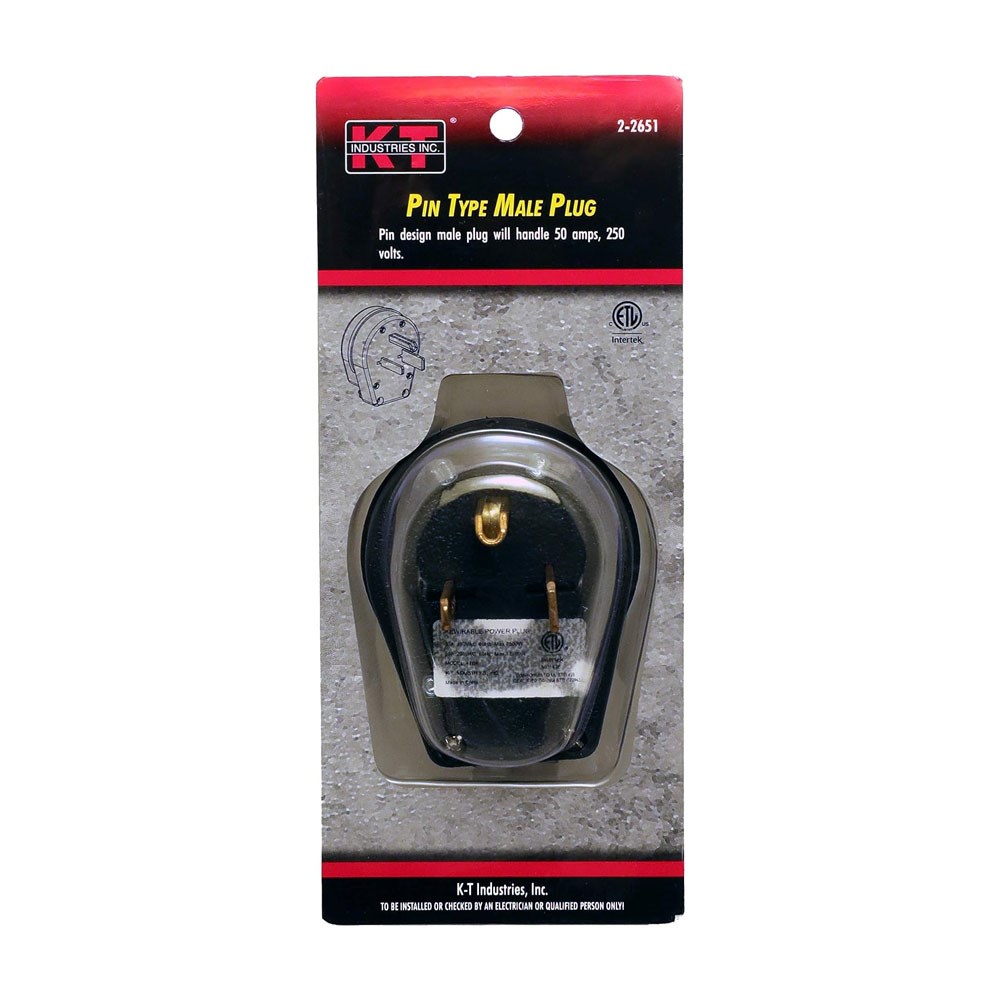 K-T INDUSTRIES PIN MALE PLUG - 50 AMP, 250VThis heavy-duty pin-type male plug handles up to 50 amps and 250 volts, making it ideal for welders, dryers, and ranges. The three-blade design accommodates most welding equipment.