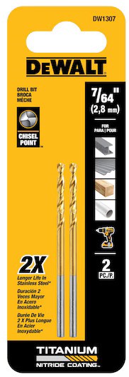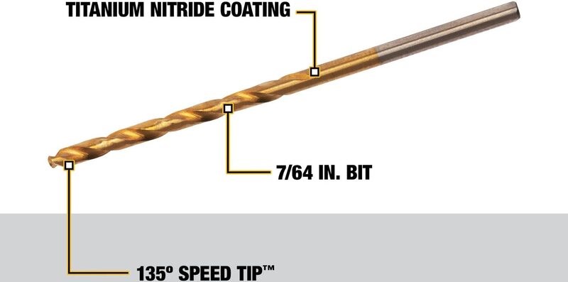 DEWALT DW1307 TITANIUM SPEED TIP DRILL BIT 7/64"High-performance titanium nitride coated drill bit for drilling in metal, wood, and plastic. The heavy-duty coating provides extended life when drilling non-ferrous metals.