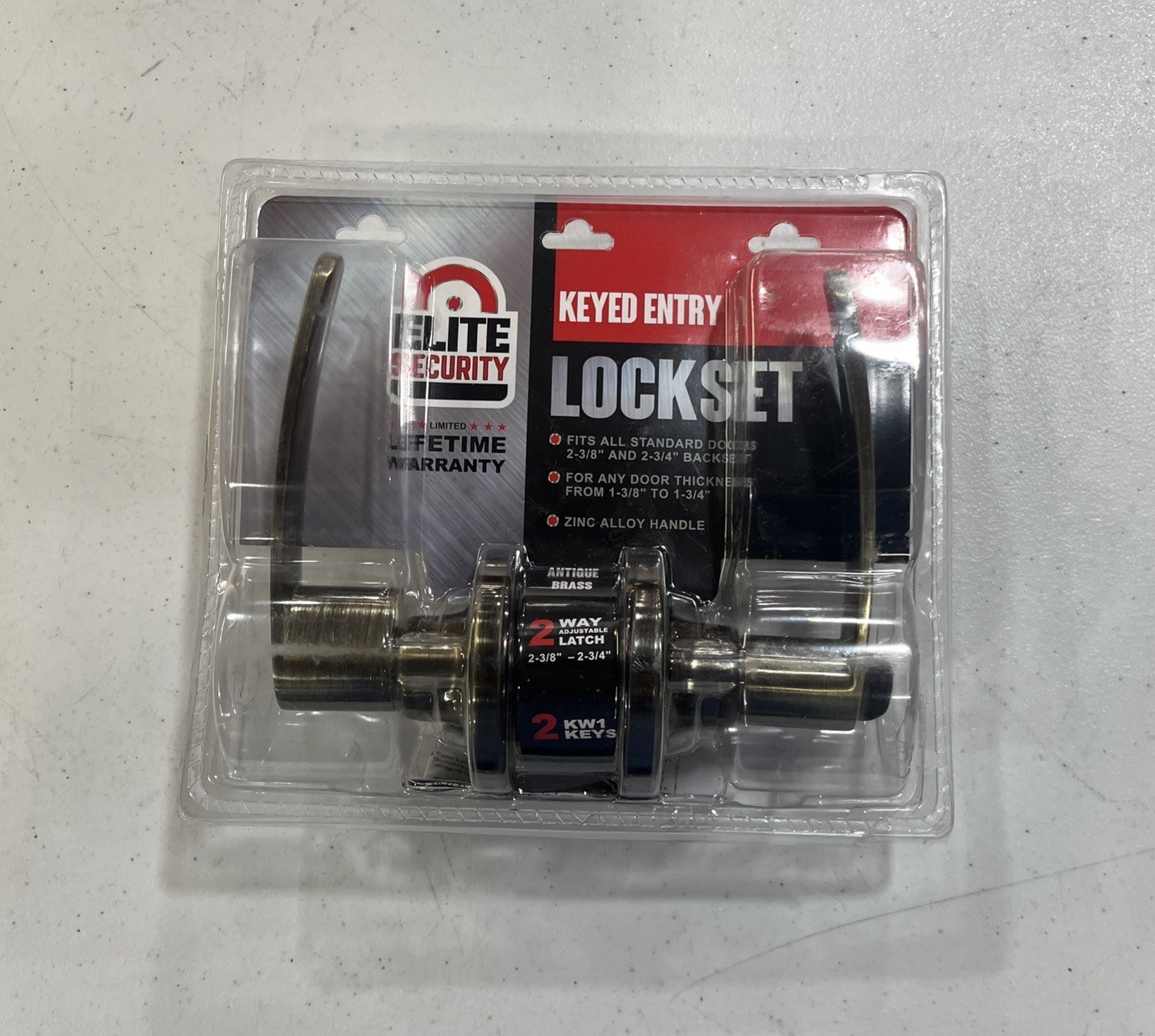 ELITE SECURITY ENTRY LEVER LOCKSET - ANTIQUE BRASSKeyed entry lever handle for exterior doors and entryways. Modern lever style pairs with standard residential hardware. Antique brass finish delivers a warm, vintage character that suits traditional and craftsman-style homes. KW1 keyway accepts standard Kwikset-compatible keys.