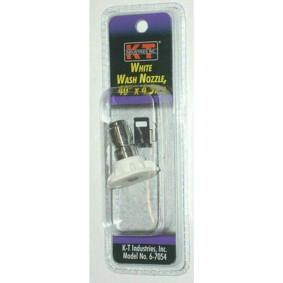 K-T INDUSTRIES 40-DEGREE PRESSURE WASHER WASH NOZZLE - 4.5MMThis 40-degree white wash nozzle delivers a wide fan spray pattern ideal for rinsing and moderate surface washing. Designed for 1/4" quick coupler pressure washers, it is rated for up to 4,000 PSI and 300 deg F and connects to all common pressure washer equipment.