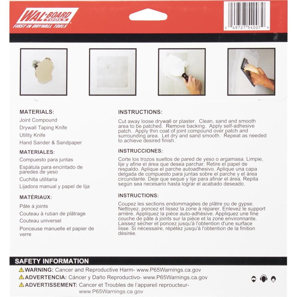 Self-adhesive drywall repair patch for fixing small to medium holes in drywall and plaster. Features a rustproof aluminum backing plate with self-adhering fiberglass mesh that holds to the wall surface during repair -- no pre-plastering needed.