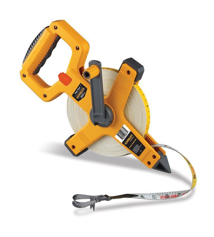 Komelon's open reel fiberglass tapes are perfect for all of your long measuring needs. The double coated fiberglass blade is waterproof and dirt resistant. The coating also protects the markings and graduations from chemical and mechanical abrasion. In addition to a heavy duty abs frame, this tape has a two color blade with double sided printing (engineer scale on back of blade) and a versatile ring end hook and claw. The 6633 is great on any jobsite or athletic field.