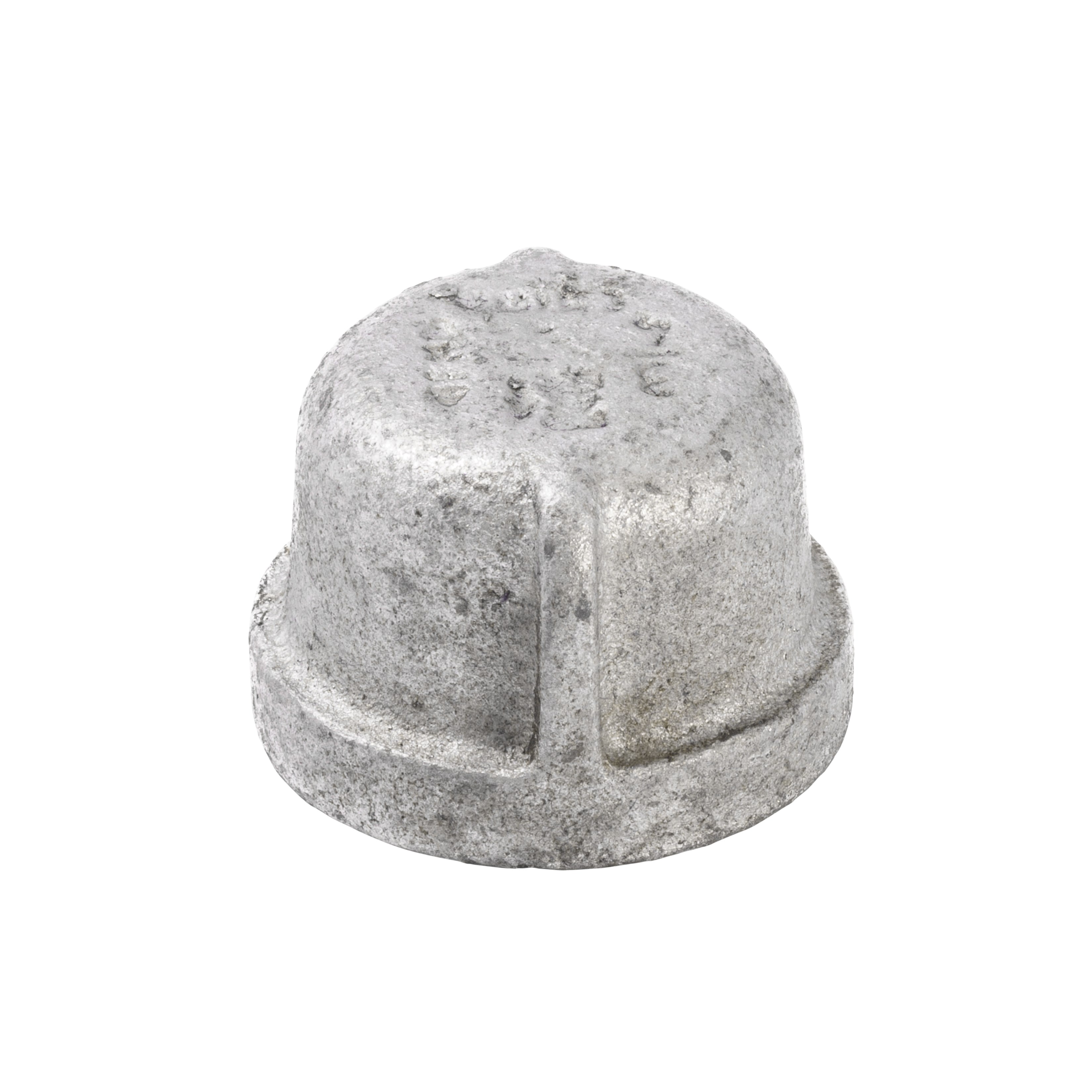 PIPE CAP, GALVANIZED (3/4")This 3/4" galvanized malleable iron pipe cap threads onto the end of a pipe to seal it off, stopping the flow of water, gas, or air. Made from ASTM A197 malleable iron for strength and durability, with female NPT threads for a secure, leak-free connection.