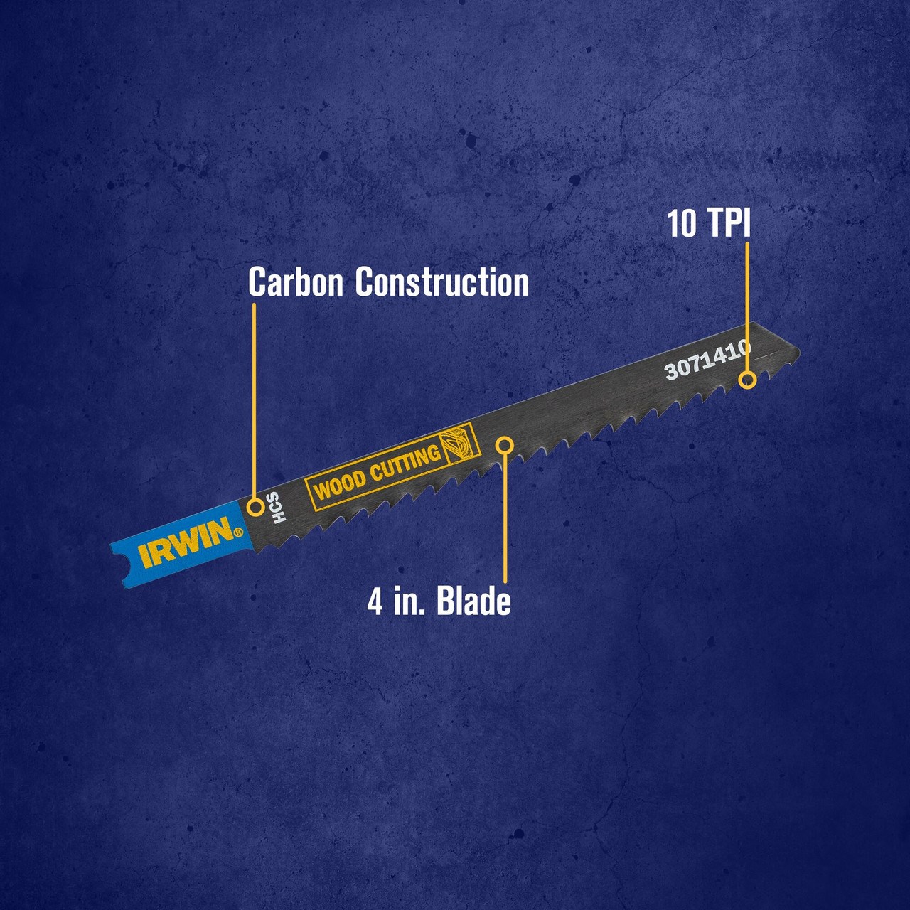 IRWIN MARATHON U-SHANK JIGSAW BLADE - 4", 10 TPI CARBONCut clean curves and straight lines in wood and plastic with this Irwin Marathon carbon steel jigsaw blade. The precision-ground, milled teeth deliver fast, smooth cuts in soft materials. The 10 TPI tooth count provides a good balance of cutting speed and finish quality for general-purpose wood cutting.
