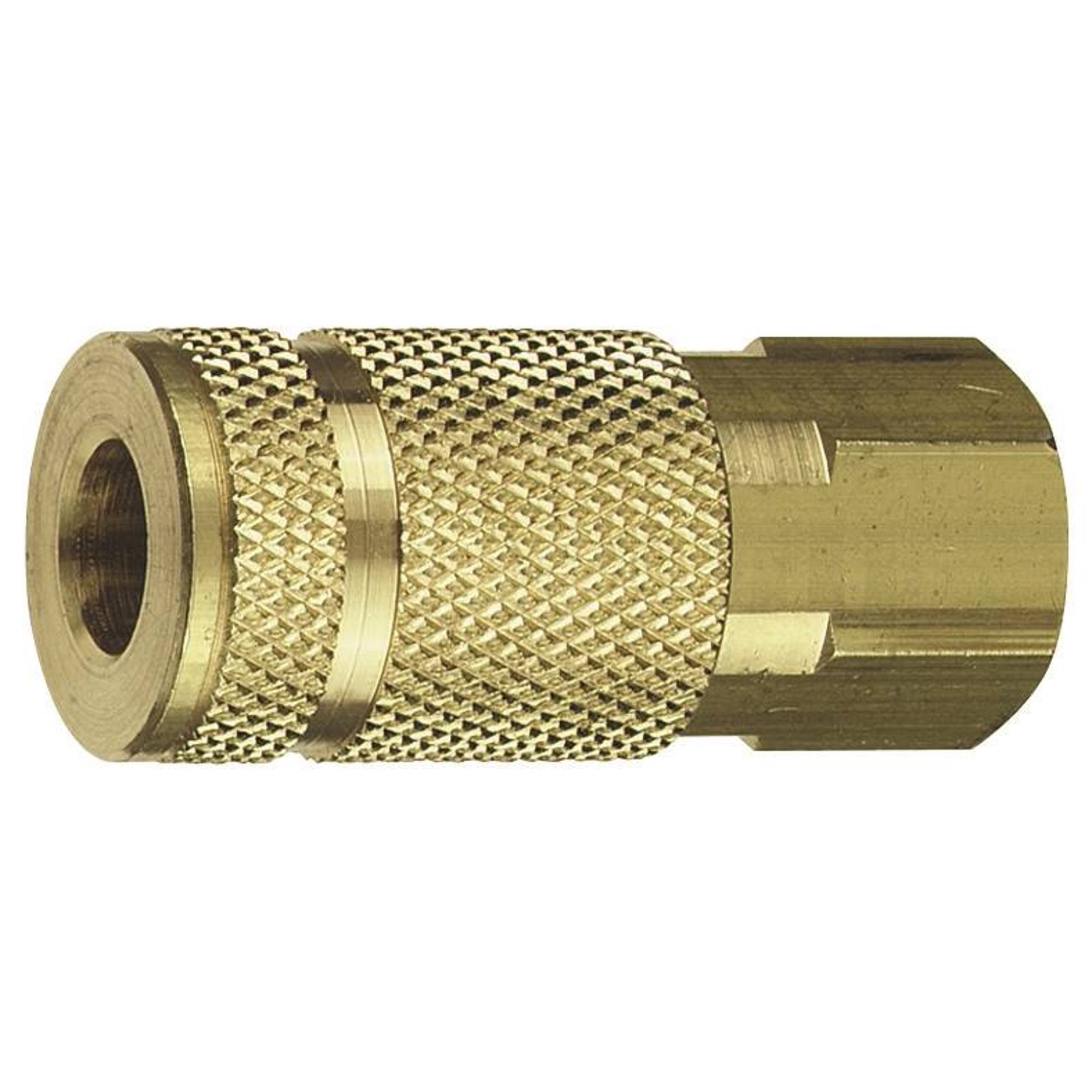 TRU-FLATE ARO A-STYLE INTERCHANGE AIR COUPLER - 1/4" FNPTBrass quick-disconnect air coupler in the ARO A-style interchange pattern, identified by the single wide band on the coupler body. Connects to ARO-style air line plugs for fast tool changes on compressed air systems. Rated for 300 PSI maximum pressure.