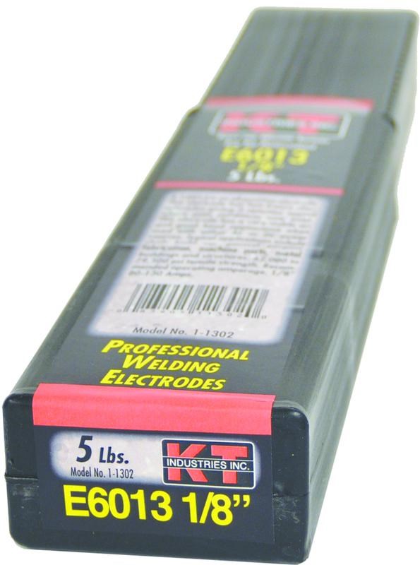 AWS E6013 WELDING ELECTRODE - 1/8", 5 LBK-T Industries E6013 electrodes are versatile all-position stick welding rods with a high-titania potassium coating for smooth, stable arc performance. The soft arc and shallow penetration make them ideal for general-purpose fabrication. Works with AC, DCEP, or DCEN power sources.