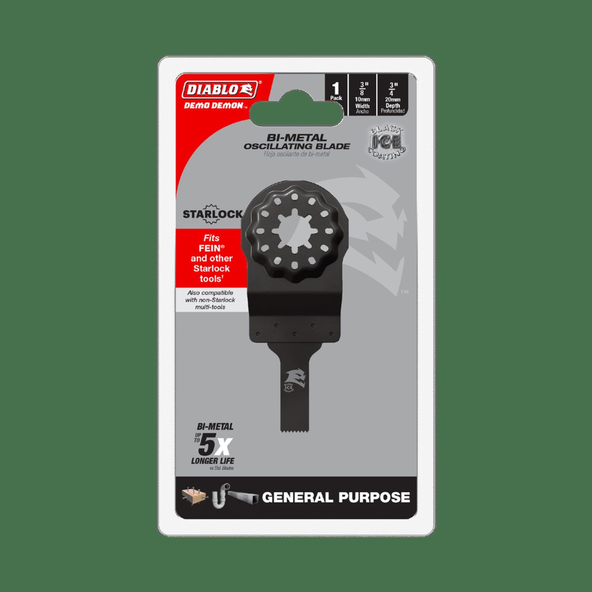 DIABLO DEMO DEMON 3/8" BI-METAL OSCILLATING BLADEThe Diablo Demo Demon universal fit bi-metal oscillating blade delivers up to 5X longer life than standard blades in general purpose cuts through nail-embedded wood, clean wood, metal, and plastics. Black I.C.E. coating keeps teeth cool and free of buildup for fast, clean cuts.
