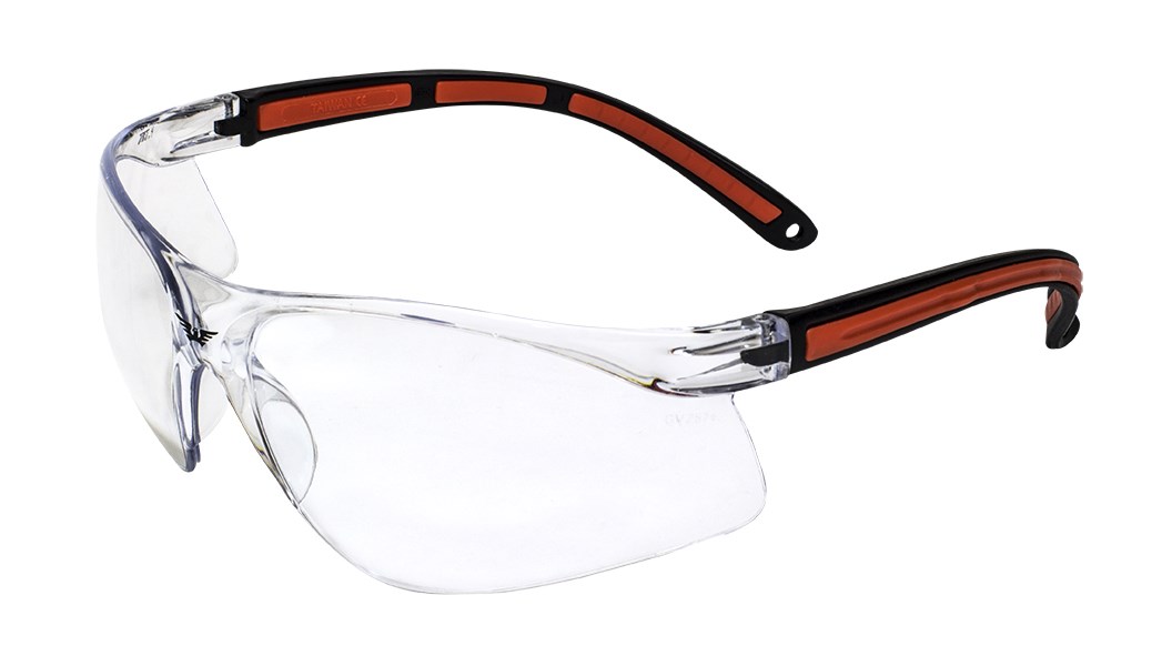 - Clear temples with orange double-injected rubber for a secure, comfortable fit