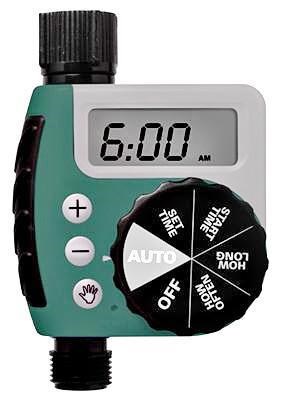 One dial allows complete timer control functionality. Cycles easily from set clock, set watering time, how often, how long, then run program. A rain delay is built into the run program function. A manual button allows program interruption.