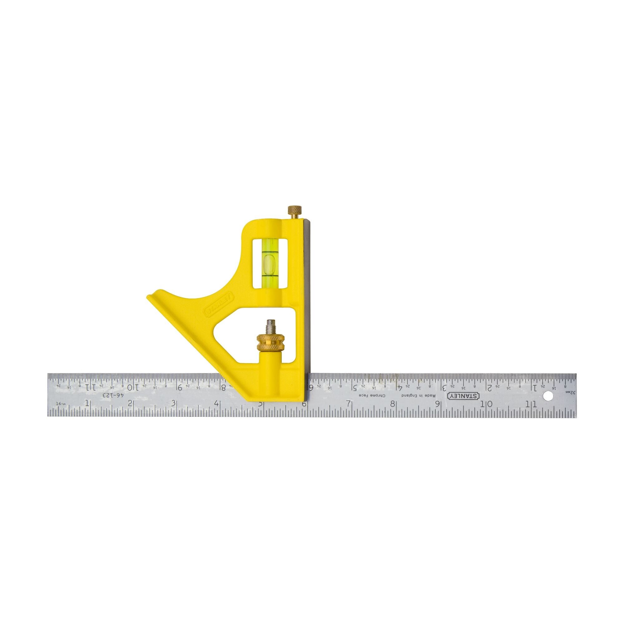 STANLEY COMBINATION SQUARE, HI-VIS - 12"The Stanley 12" Combination Square features a durable hard chrome-plated blade and a high-visibility yellow die-cast handle for easy spotting on the jobsite. Precision-machined working surfaces ensure accurate 90-degree and 45-degree measurements, and the built-in scriber and level vial make this a versatile layout tool.