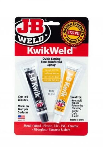 J-B KwikWeld has a 1:1 mixing ratio, sets in 6 minutes and is fully cured in 4-6 hours. J-B KwikWeld cures to a dark grey color, is rated at a tensile strength of 2424 PSI & will withstand temperatures up to 300 degrees F.