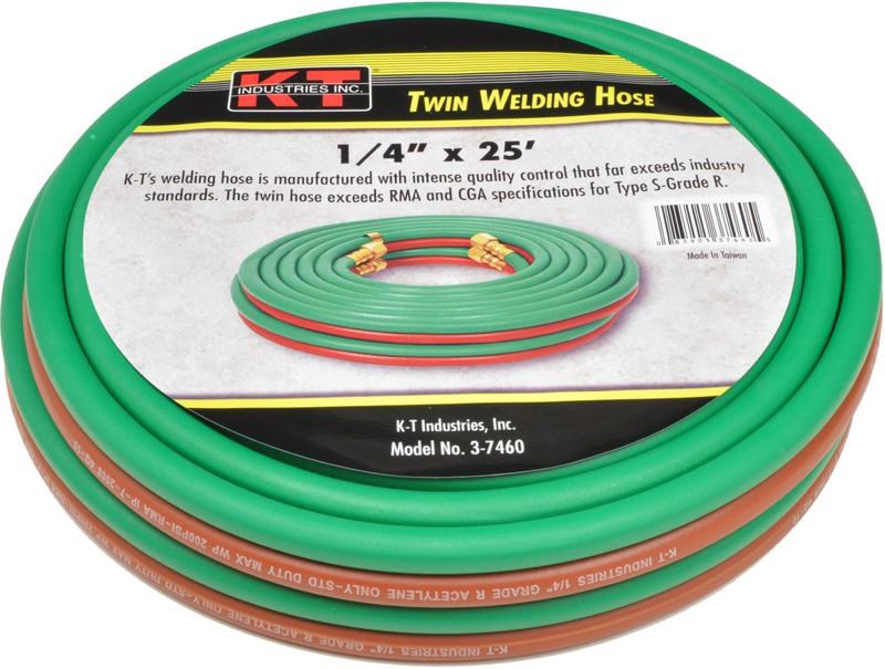 K-T INDUSTRIES TWIN WELDING HOSE - 1/4" x 25 FTK-T Industries twin welding hose delivers reliable gas supply for oxy-acetylene welding and cutting applications. The larger 1/4" ID provides increased gas flow for higher-demand torches and longer runs. Manufactured with intense quality control, this hose exceeds RMA and CGA specifications for Type S grade.