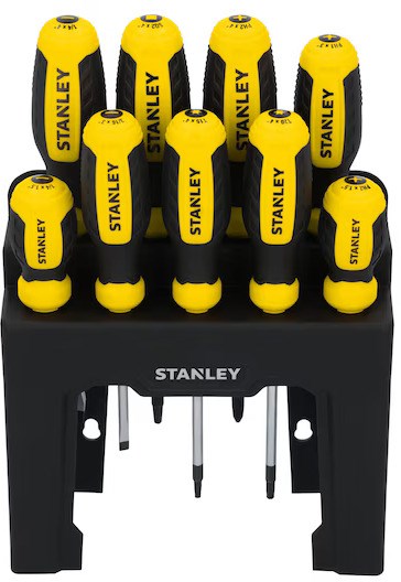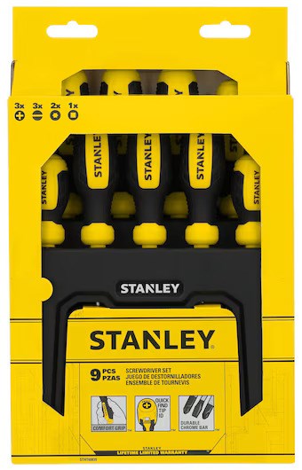 STANLEY 9-PIECE SCREWDRIVER SET WITH STANDHandle a variety of fastening jobs with this versatile 9-piece screwdriver set from Stanley. Each screwdriver features a bi-material handle designed with three specific zones for precision, torque, and speed applications.