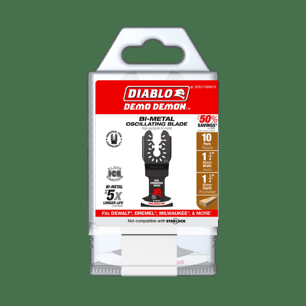 DIABLO DEMO DEMON BI-METAL OSCILLATING BLADE - 1-3/4", 10-PACKThe Diablo Demo Demon 1-3/4" bi-metal oscillating blade delivers up to 5X longer life than standard bi-metal blades when cutting nail-embedded wood. The ultra-hardened cutting edge and curve contact edge technology provide precise, clean plunge cuts with reduced vibration for professional results in remodeling and demolition work.