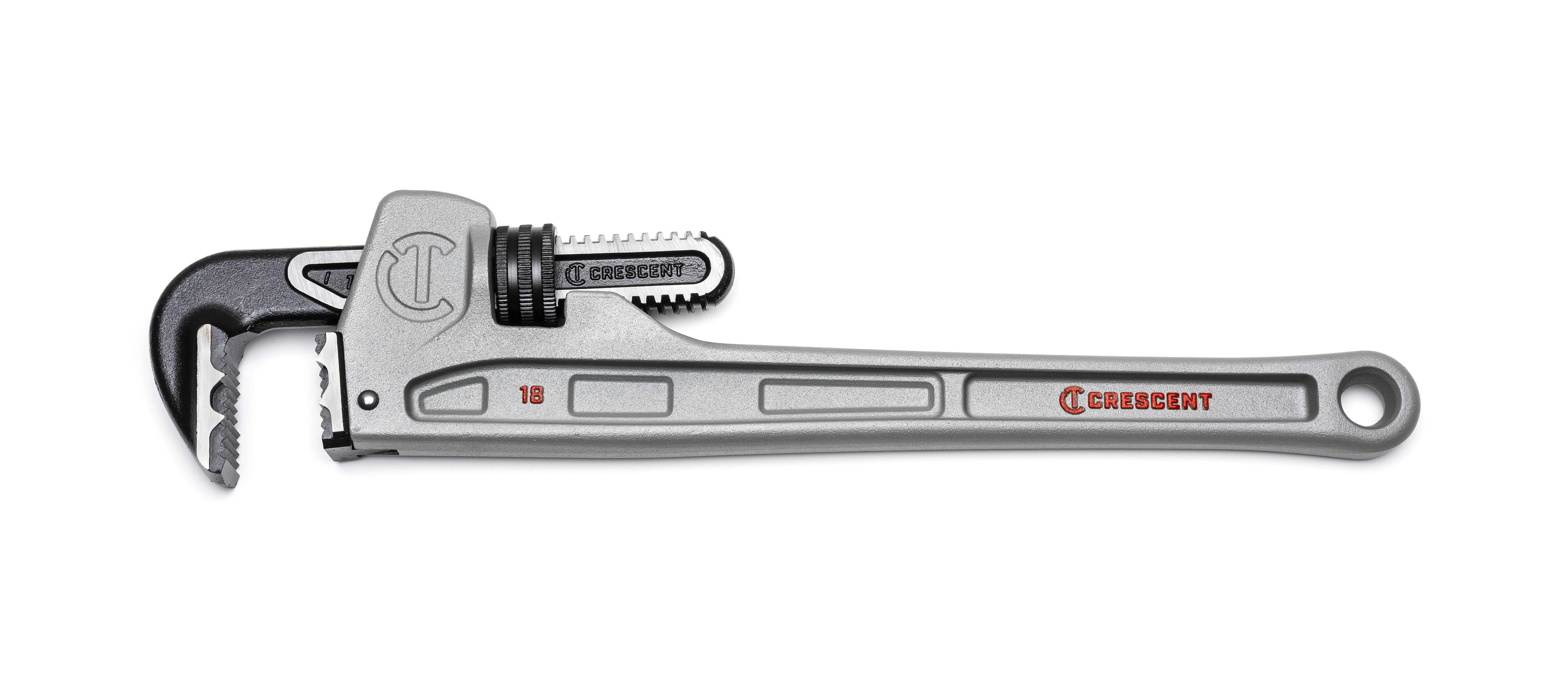 CRESCENT ALUMINUM PIPE WRENCH - 18"Work with less fatigue using this Crescent aluminum pipe wrench. At 40% lighter than traditional cast iron wrenches, the aluminum body reduces strain during overhead and extended use without sacrificing strength.