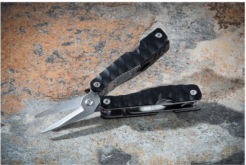 Features: scissors, 2.5" drop point blade, Phillips screwdriver, bottle opener, can opener, mini slotted screwdriver and saw