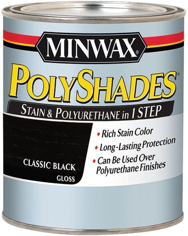 Enjoy the benefits of an all-in-one stain and polyurethane with the Minwax PolyShades 1 qt. Classic Black Gloss Stain and Polyurethane. The stain and polyurethane is ideal for use on interior wood surfaces and is formulated for application with either a foam applicator or natural-bristle brush.