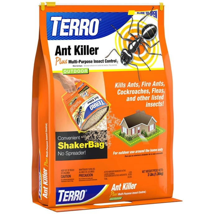 TERRO ANT KILLER PLUS MULTI-PURPOSE INSECT CONTROLTERRO Ant Killer Plus is a fast-acting granular insecticide that kills ants and other listed insects within 24 hours. The convenient resealable shaker bag requires no spreader -- just shake the granules where pests are active. Effective as a perimeter treatment around foundations or directly on ant mounds.