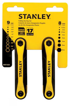 STANLEY 17-PIECE FOLDING HEX KEY SETAccess both SAE and metric hex fasteners with this compact folding hex key set from Stanley. The durable composite construction features rubber side inserts for a secure grip, while chamfered edges guide each key for smooth entry.