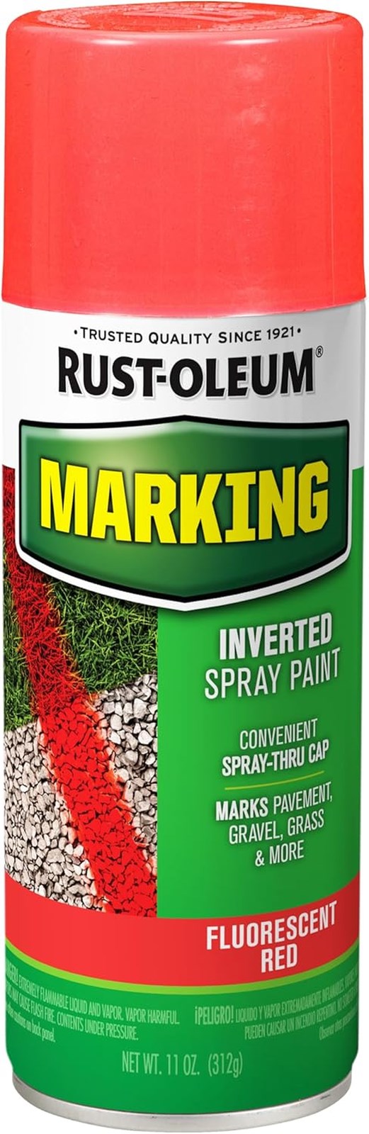 RUST-OLEUM INVERTED MARKING PAINT - FLUORESCENT REDRust-Oleum Professional inverted marking paint marks the spot in bright, highly visible fluorescent red. This spray temporarily adheres to grass, gravel, soil, lumber, concrete, and blacktop while withstanding general weathering. The convenient spray-through cap makes it ideal for outdoor marking applications.