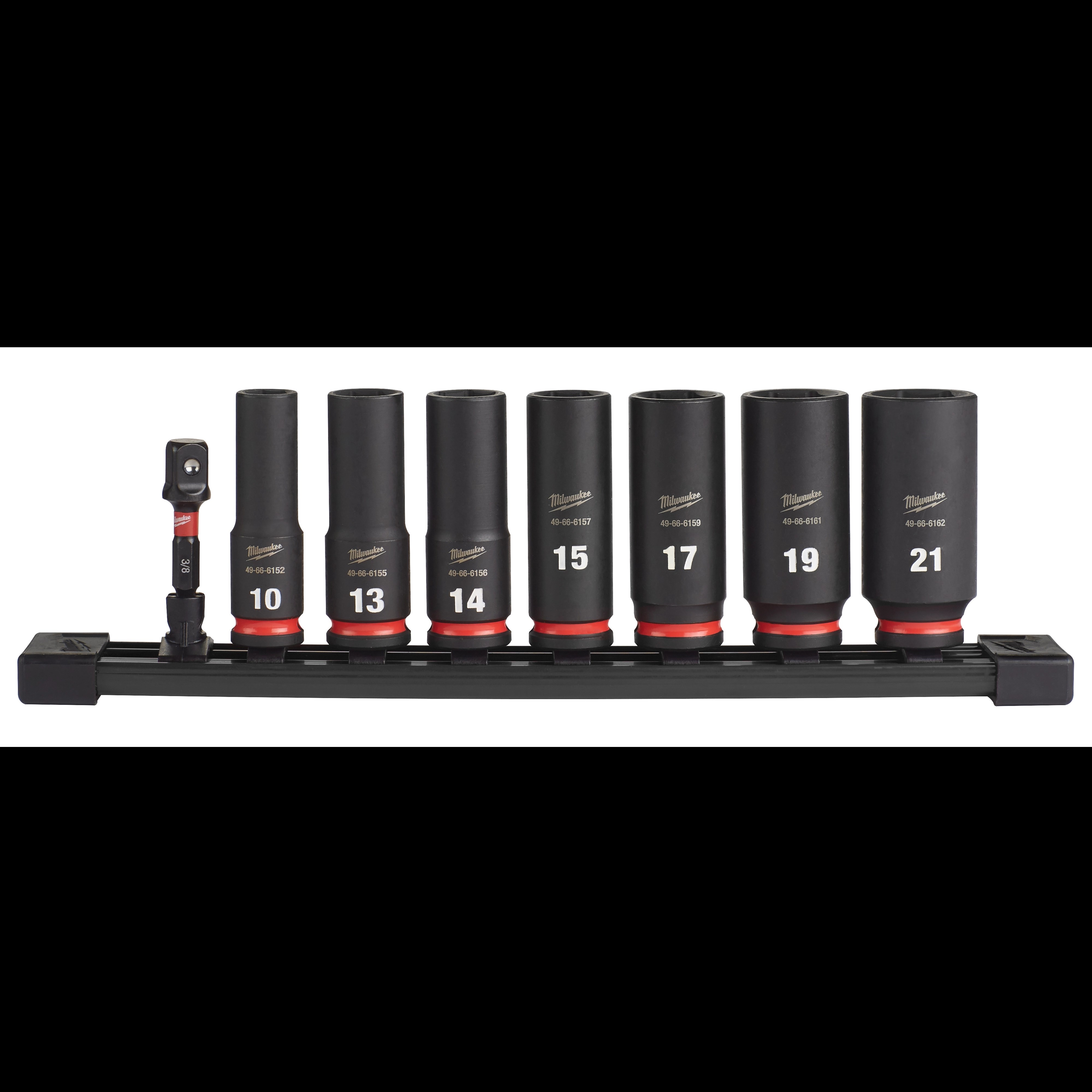 MILWAUKEE SHOCKWAVE IMPACT DUTY 3/8" METRIC DEEP SOCKET SET - 8PCThe Milwaukee Shockwave Impact Duty socket set features 7 deep metric sockets and 1 socket adapter, all built from forged impact steel to withstand the high torque of impact drivers. The 6-point design and non-slip hex geometry deliver a secure grip on fasteners while preventing rounding.