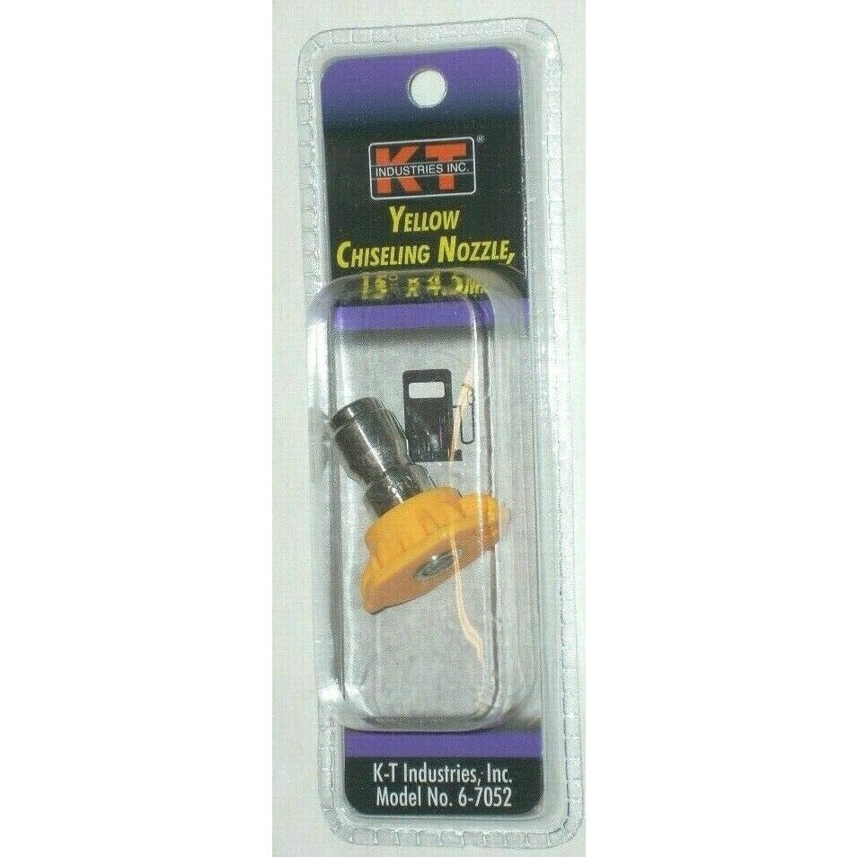 K-T INDUSTRIES YELLOW CHISELING PRESSURE WASHER NOZZLE - 4.5MMThis 15-degree yellow chiseling nozzle delivers a powerful, concentrated spray for stripping paint, removing grease, and blasting caked-on dirt from hard surfaces. The 4.5mm orifice connects to any standard 1/4" quick connect coupler and is compatible with most gas-powered pressure washers.