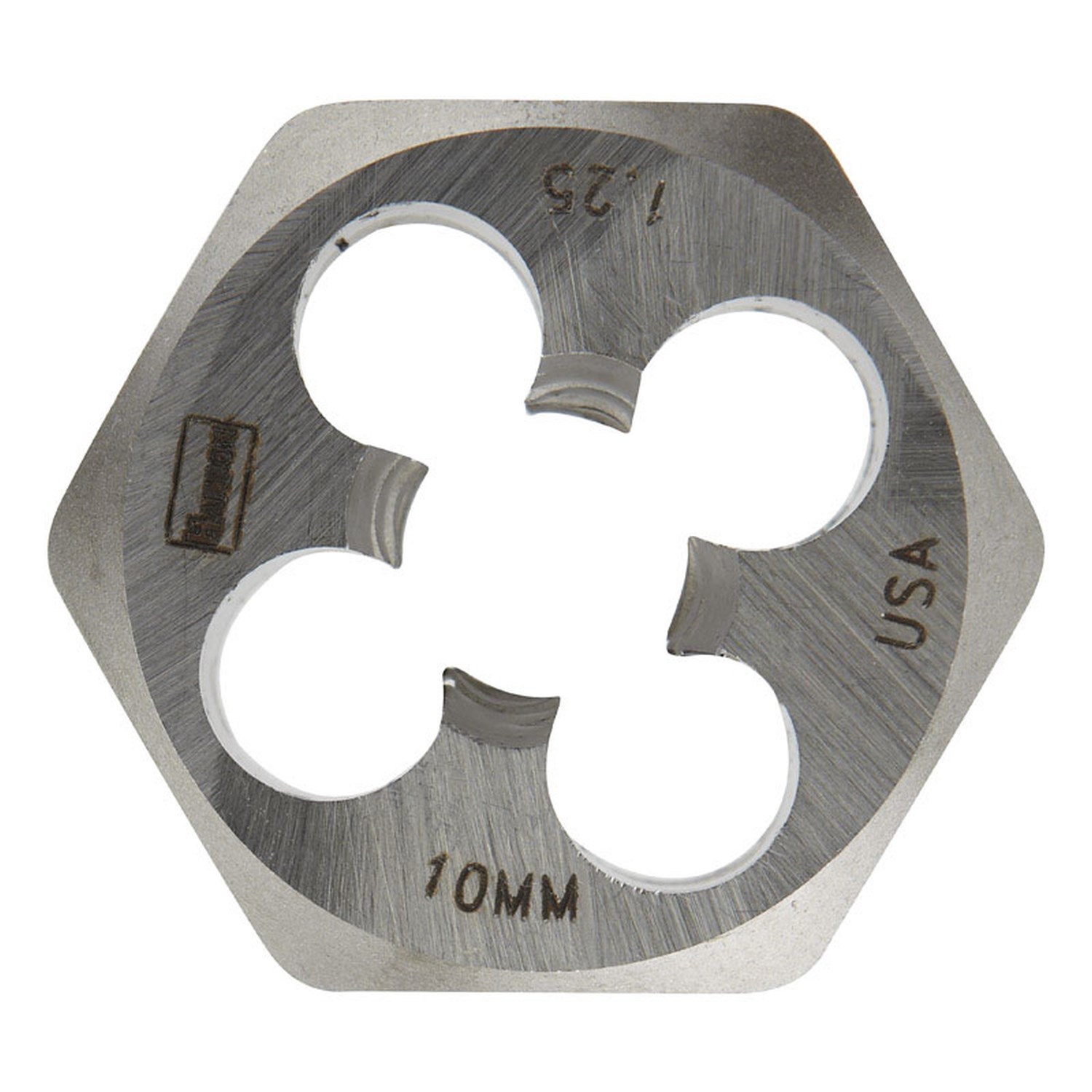 CH HANSON HIGH CARBON STEEL METRIC HEX DIE - M10 x 1.25M10 x 1.25 metric hex die made from high carbon steel. Features a 1-inch hex body that fits standard die stocks and die handles. Designed for cutting new metric threads or restoring damaged threads in tight spaces.