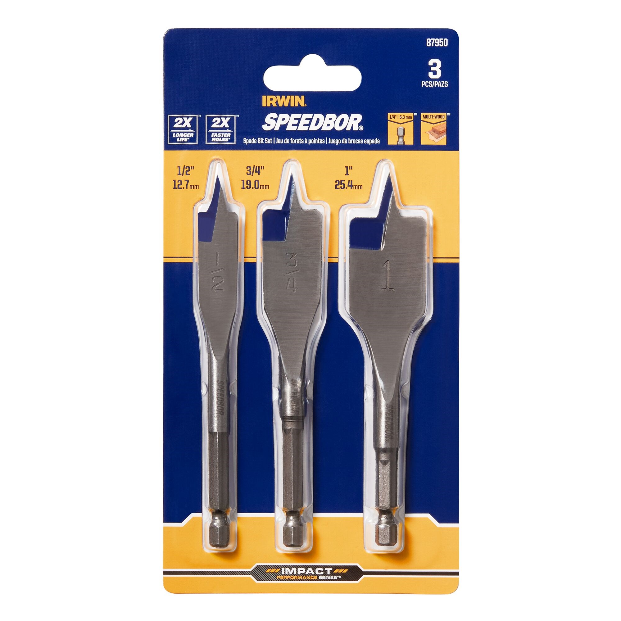 IRWIN SPEEDBOR BLUE GROOVE FLAT BIT SET - 3 PIECEGet fast, clean holes in wood with the Irwin Speedbor Blue Groove Spade Bit Set. These bits feature the patented Blue Groove cutting edge that shears wood fibers cleanly and channels sawdust out of the hole, reducing heat and bit walking. Double cutting spurs scribe the outside of the hole for reduced breakout. The 1/4" quick-change hex shank seats securely in any drill chuck or quick-release holder for fast bit swaps on the job.