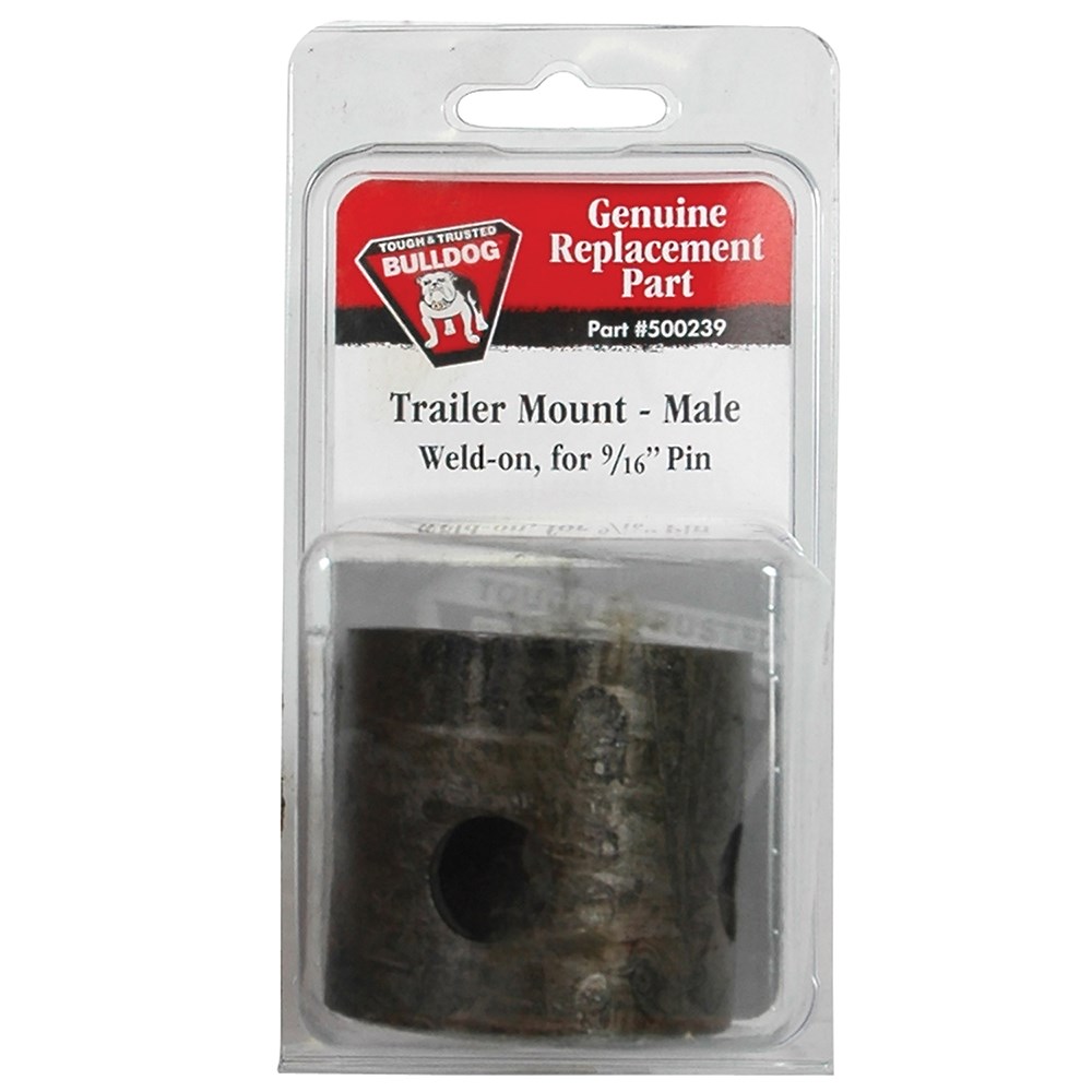 BULLDOG WELD-ON TUBE MOUNT FOR TRAILER JACKSReplacement tubular male weld-on mount for BullDog trailer jacks. Welds to the trailer tongue so the jack can be inserted with a 9/16" pull pin and swiveled out of the way when not in use.
