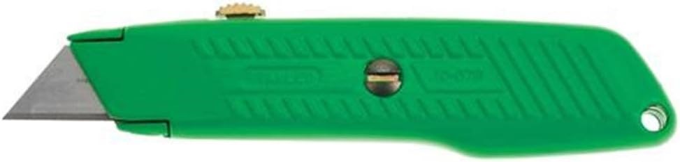 The Stanley 10-179 Hi-Viz utility knife features a high-visibility green case that is easy to spot on the job site. The retractable blade with interlock nose design keeps the blade securely in position during use.
