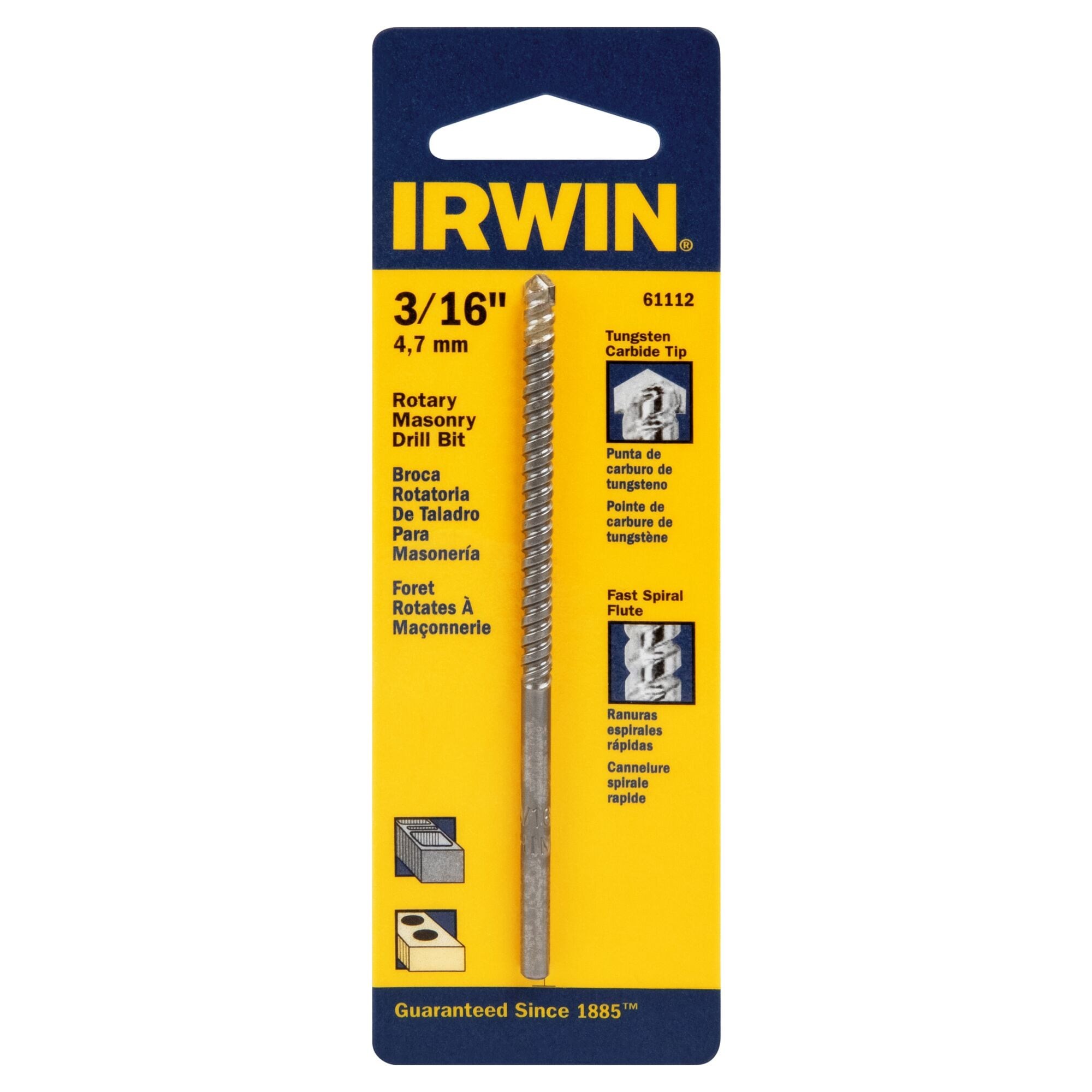 IRWIN ROTARY MASONRY DRILL BIT - 3/16"The Irwin rotary masonry drill bit features a carbide tip for drilling into concrete, brick, block, and other masonry materials. The 1/4" straight shank fits standard drill chucks, making this an ideal all-purpose bit for DIY and light-duty masonry drilling.