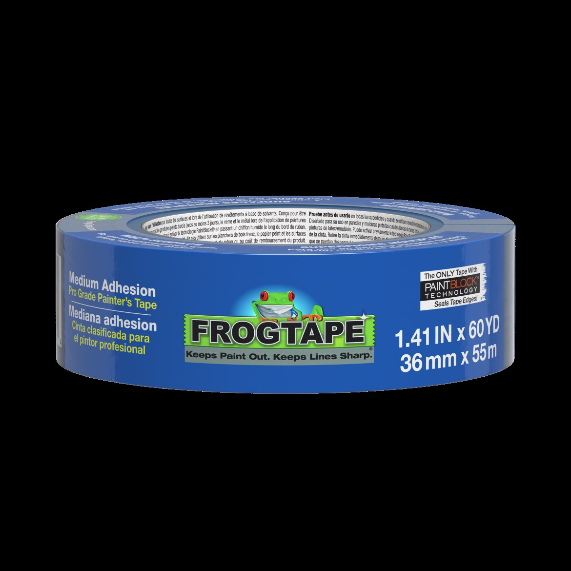 FROGTAPE PRO GRADE PAINTER'S TAPE, BLUE - 1.41" x 60 YDFrogTape Pro Grade Blue painter's tape (CP-130) features PaintBlock Technology that reacts with the water in latex paint to form a micro-barrier along the edges, delivering sharp, clean paint lines. The 5.4 mil crepe paper backing with rubber adhesive provides reliable adhesion on smooth to lightly textured surfaces and removes cleanly for up to 14 days. Works for interior and exterior projects.