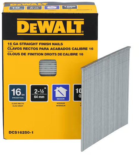DEWALT 16-GAUGE STRAIGHT FINISH NAILS - 2-1/2"DeWalt DCS16 series 16-gauge straight finish nails are designed for interior trim and finish work. Made from galvanized carbon steel with a chisel point for reduced material splitting, these nails deliver consistent drivability in 16-gauge straight finish nailers.