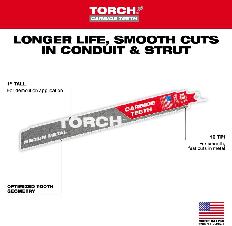 MILWAUKEE TORCH CARBIDE TEETH RECIPROCATING SAW BLADE - 9", 10 TPI, 5-PACKMilwaukee's Torch reciprocating saw blade with carbide teeth delivers longer life and smoother cuts in medium-thickness metal compared to standard bi-metal blades. The 10 TPI tooth pattern is optimized for smooth, fast cutting in conduit, strut, and pipe.