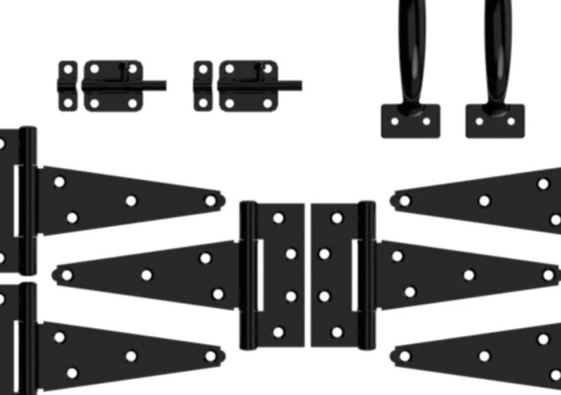 Includes: (6) T-hinges, (2) Barrel bolts, (2) Pulls & (1) Swivel staple safety hasp